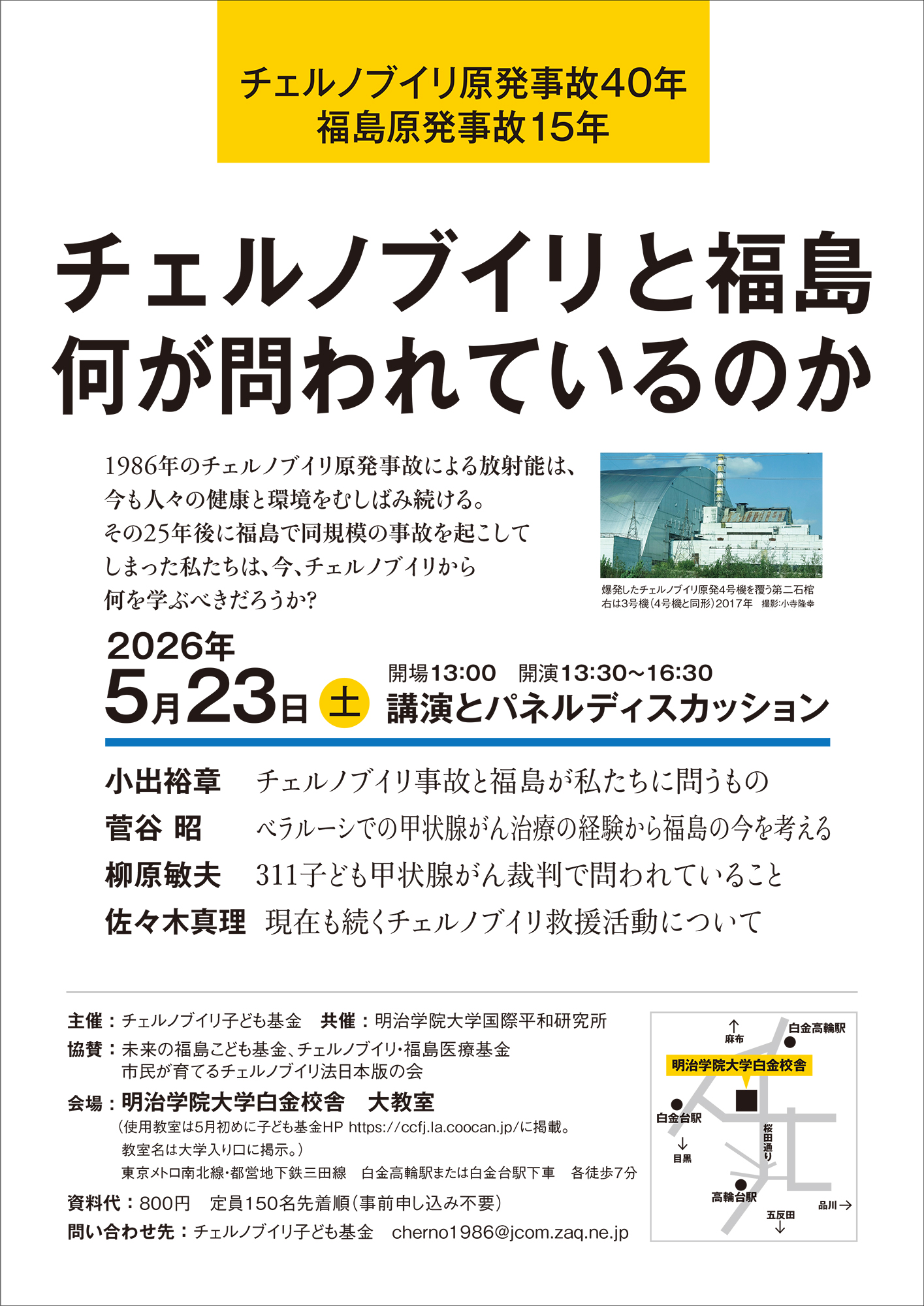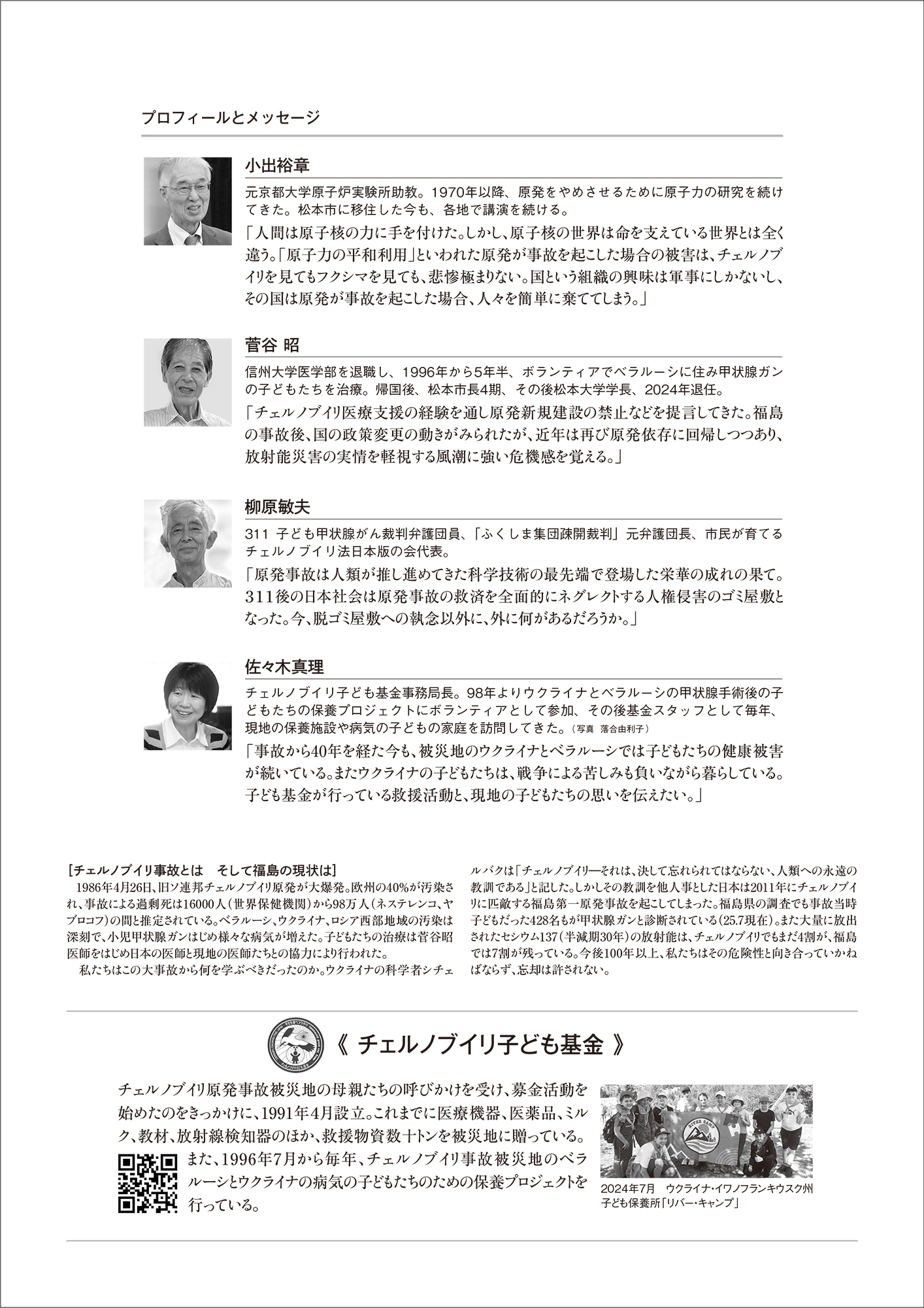 私たちはロシア軍のウクライナ侵攻に抗議します。 ロシア軍の撤退を強く求めます。 ウクライナの人々の平和を願います。 ロシア軍のウクライナ侵攻、民衆の殺戮、そして原発への攻撃に抗議し、ロシア軍の即時撤退を求める 2022年3月5日 チェルノブイリ子ども基金 ★子ども基金のブログもぜひご覧ください。 【チェルノブイリ原発事故40年 福島原発事故15年】 チェルノブイリと福島 何が問われているのか 5月23日(土)開場13:00 開演13:30~16:30 1986年のチェルノブイリ原発事故による放射能は、今も人々の健康と環境をむしばみ続ける。その25年後に福島で同規模の事故を起こしてしまった私たちは、今、チェルノブイリから何を学ぶべきだろうか? 講演とパネルディスカッション 小出 裕章 チェルノブイリ事故と福島が私たちに問うもの 菅谷 昭 ベラルーシでの甲状腺がん治療の経験から福島の今を考える 柳原 敏夫 311子ども甲状腺がん裁判で問われていること 佐々木 真理 現在も続くチェルノブイリ救援活動について 主催:チェルノブイリ子ども基金 共催:明治学院大学国際平和研究所 協賛:未来の福島こども基金、チェルノブイリ・福島医療基金、市民が育てるチェルノブイリ法日本版の会 会場 明治学院大学白金校舎 大教室 (使用教室は5月初めに子ども基金HP https://ccfj.la.coocan.jp/に掲載。教室名は大学入り口に掲示。) 東京メトロ南北線・都営地下鉄三田線 白金高輪駅または白金台駅下車 各徒歩7分 資料代 800円 定員150名先着順(事前申し込み不要) 問い合わせ先:チェルノブイリ子ども基金 cherno1986@jcom.zaq.ne.jp チラシ表 チラシ裏 ●ニュース133号(2026年2月号)を発行しました こちらからご覧ください ニュースレターの購読をご希望の方は事務局までご連絡ください。 年間購読料は2000円です。 Tel&Fax 03-6767-8808 振込先番号:郵便振替 00160-4-98316 口座名:チェルノブイリ子ども基金 子ども基金NEWS バックナンバー ●ボランティア募集:子ども基金ニュースレターの発送作業 ニュース発送作業(年3回:2・6・10月):お手伝いいただける方を募集します。どなたでもお気軽にご参加ください。 次回は2026年6月中旬を予定しています。感染対策のため日程・定員が流動的ですので、関心のある方は事務局へお問い合わせ下さい。 場所:東京ボランティア・市民活動センター(飯田橋駅ビル セントラルプラザ10階) ※ボランティア参加をご希望の方は、メールかお電話でご連絡ください。電話は平日午前10時~午後5時。留守の場合は伝言をお願いします。 E-mail cherno1986@jcom.zaq.ne.jp 電話/FAX 03-6767-8808 週刊文春2019年1月3日・10日号に掲載された広河隆一氏の記事に関して 2018年12月27日 甲状腺手術を受けたインナ(ウクライナ・キエフ市)の手紙 ![]() インナは12歳のとき(現在29歳)、甲状腺ガンの手術を受け、その後ずっと薬を服用しています。手術後、「チェルノブイリ子ども基金」主催の現地サナトリウムでの保養に招待されたり、「子ども基金」が支援した薬を現地の救援団体や病院を通じて受け取ったりしてきました。妊娠がわかったとき、医師からは出産を諦めるように言われましたが、2008年に女児を出産しました。 「インナの手紙」 「インナの手紙 英語」 救援キャンペーンの報告 ●2007年 チェルノブイリ21周年救援キャンペーン ●2008年 チェルノブイリ22周年救援キャンペーン ●2009年 チェルノブイリ23周年救援キャンペーン ●2010年 チェルノブイリ24周年救援キャンペーン ●2011年 チェルノブイリ25周年救援キャンペーン 2011.11.20「放射線被ばくから子どもを守るために」黒部信一(小児科医師)講演資料 ●2012年 チェルノブイリ26周年救援キャンペーン<動画あり> ●2013年 チェルノブイリ27周年救援キャンペーン ●2014年 チェルノブイリ28周年救援キャンペーン インナさんの母親からのメッセージ(2014年) ●2015年 チェルノブイリ29周年救援キャンペーン ●2016年 チェルノブイリ30周年救援キャンペーン ●2017年 チェルノブイリ31周年救援キャンペーン ●2018年 チェルノブイリ32周年救援キャンペーン ●2019年 チェルノブイリ33周年救援キャンペーン ●2021年 チェルノブイリ35周年救援キャンペーン ●2022年 チェルノブイリ36周年救援キャンペーン ●2023年 チェルノブイリ37周年救援キャンペーン ●2024年 チェルノブイリ38周年救援キャンペーン ●2025年 『戦禍の子どもたち~ウクライナの絵画展~』 ●販売品のご案内 お申込みはcherno1986@jcom.zaq.ne.jpにメールを下さい 絵葉書・書籍などをお買い上げいただくことで、被災地の子どもたちの救援活動にご参加いただけます。収益は子どもたちの薬代・転地療養費用として活用されます ● ご注文方法:①住所 ②電話番号 ③氏名 ④希望品名と数量を明記の上、FAX・TEL・メールでお申し込みください。 ●送料別 ●お支払い方法:振込用紙を同封しますので、品物が届きましたらお振込みください。 「リネンクロス」ベラルーシ製 サイズ49㎝x70㎝ 1枚 800円 ※柄はお任せください